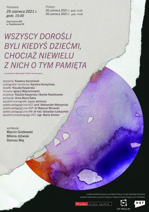 25 czerwca 2021 r. w czarnej sali Akademii Sztuk Teatralnych im. St. Wyspiańskiego we Wrocławiu odbyła się premiera spektaklu warsztatowego „Wszyscy dorośli byli kiedyś dziećmi, chociaż niewielu z nich o tym pamięta” ze scenografią studentki IV roku Scenografii Karoliny Kempińskiej.