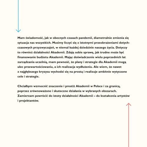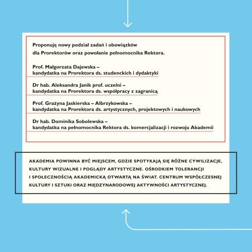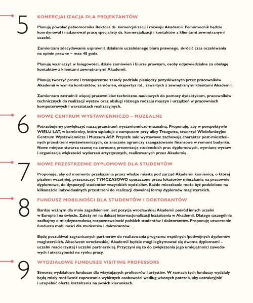 Chciałbym wzmocnić prestiż i znaczenie uczelni w Polsce i za granicą, poprzez zrównoważone i skuteczne działania w wybranych obszarach. Zamierzam powrócić do istoty działalności Akademii – do kształcenia artystów i projektantów.