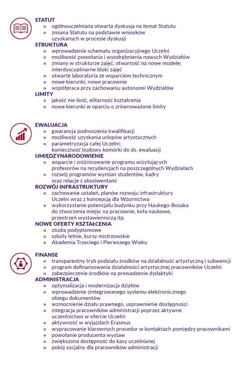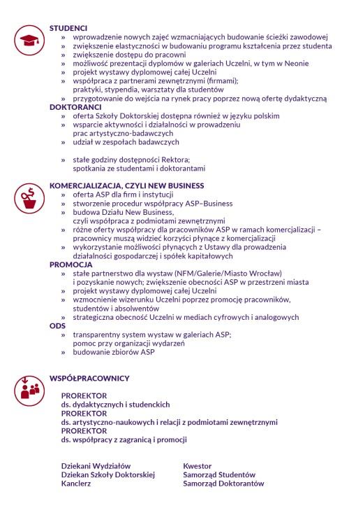Naturalnymi współpracownikami rektora są prorektorzy i dziekani, kierownictwo administracji oraz samorząd studentów i samorząd doktorantów. Jednak zależy mi na modelu partnerskiej współpracy z każdym, bo przecież wszyscy tworzymy wspólnotę, dla której ważny jest rozwój naszej Uczelni, budowanie jej prestiżu i stworzenie miejsca otwartego i twórczego, które będzie synonimem szeroko rozumianej kreatywności.