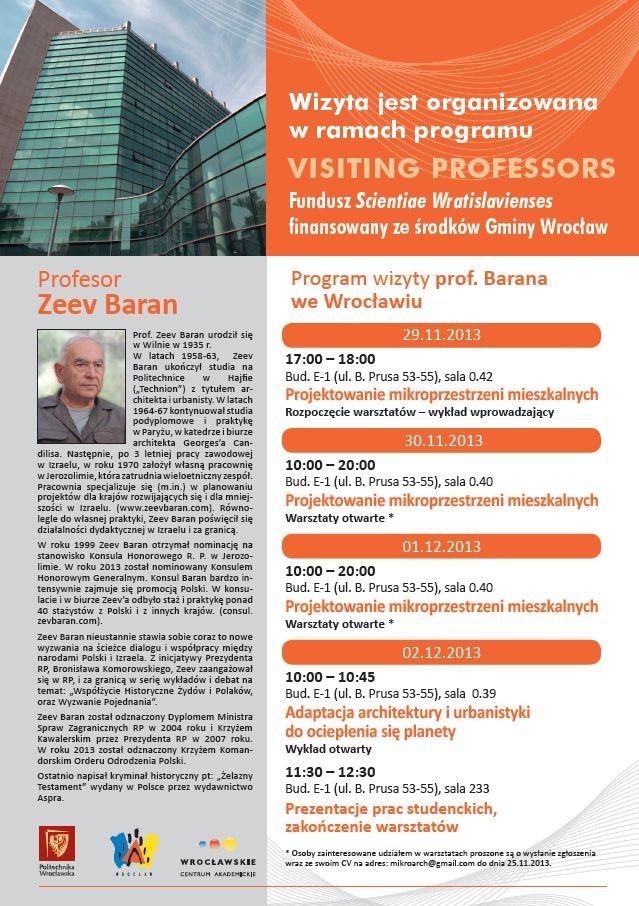 Politechnika Wrocławska zaprasza wszystkich zainteresowanych na wykłady i seminaria prowadzone przez wybitnego architekta, prof. Zeeva Barana. Wizyta odbędzie się w dniach 29 listopada – 2 grudnia 2013r. w ramach programu Visiting Professors.