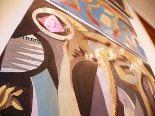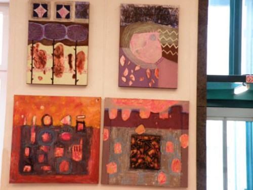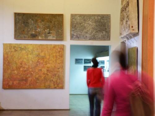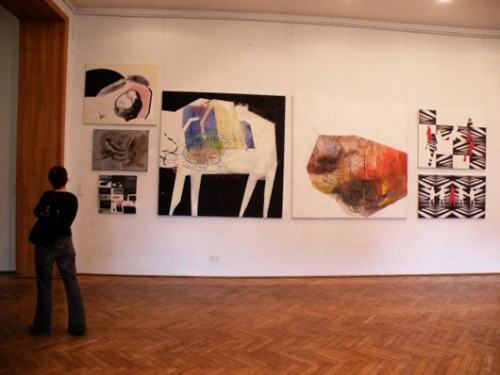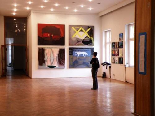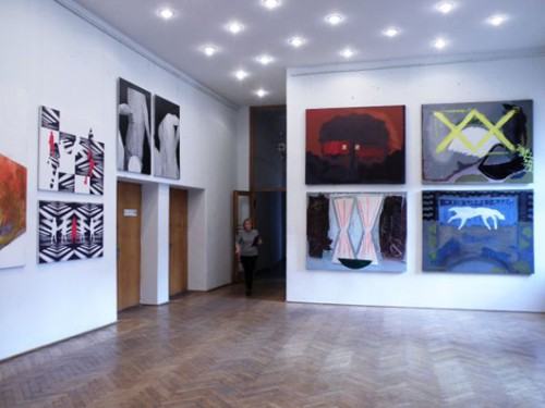Wystawa podzielona jest na dwie części. W auli prace na papierach, a w holu przed nią obrazy na płótnach.