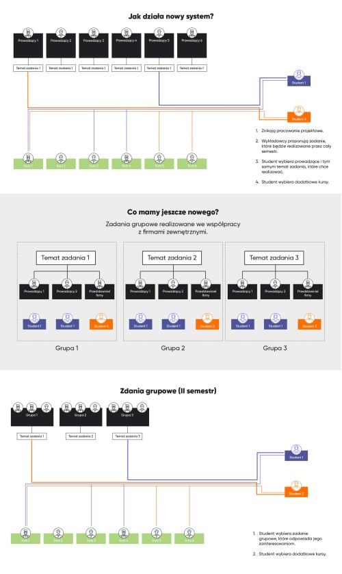 Na drugim semestrze pierwszego roku są realizowane zadania w grupach (2 lub 3 grupy) składających się z pedagogów i studentów. Zadania te są realizowane z podmiotami zewnętrznymi i dotyczą realnych problemów zaproszonych do współpracy firm i instytucji.