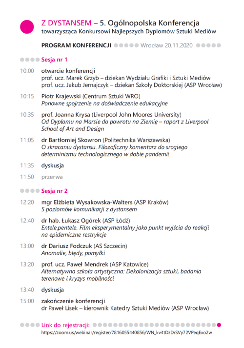 - 10:00 otwarcie konferencjiprof. ucz. Marek Grzyb – dziekan Wydziału Grafiki i Sztuki Mediów