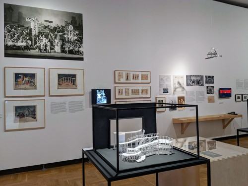 Można na niej zobaczyć między innymi cyfrową rekonstrukcję Teatru Symultanicznego w formie modelu 3D i animacji VR 360 autorstwa dra Tomasza Brzezińskiego oraz makiety wykonane przez studentów Katedry Scenografii w ramach warsztatów Instytutu Teatralnego im. Zbigniewa Raszewskiego, pod kierunkiem dra Tomasza Brzezińskiego i przy współudziale dra Damiana Banasza i dra Bartosza Zamarka. Wystawa pokazuje w nowym świetle najważniejsze zjawiska scenograficzne kształtujące estetykę przedstawień teatralnych i wydarzeń społecznych w Polsce na przestrzeni ponad 100 lat. Wystawa potrwa do 19 stycznia 2020 roku.
