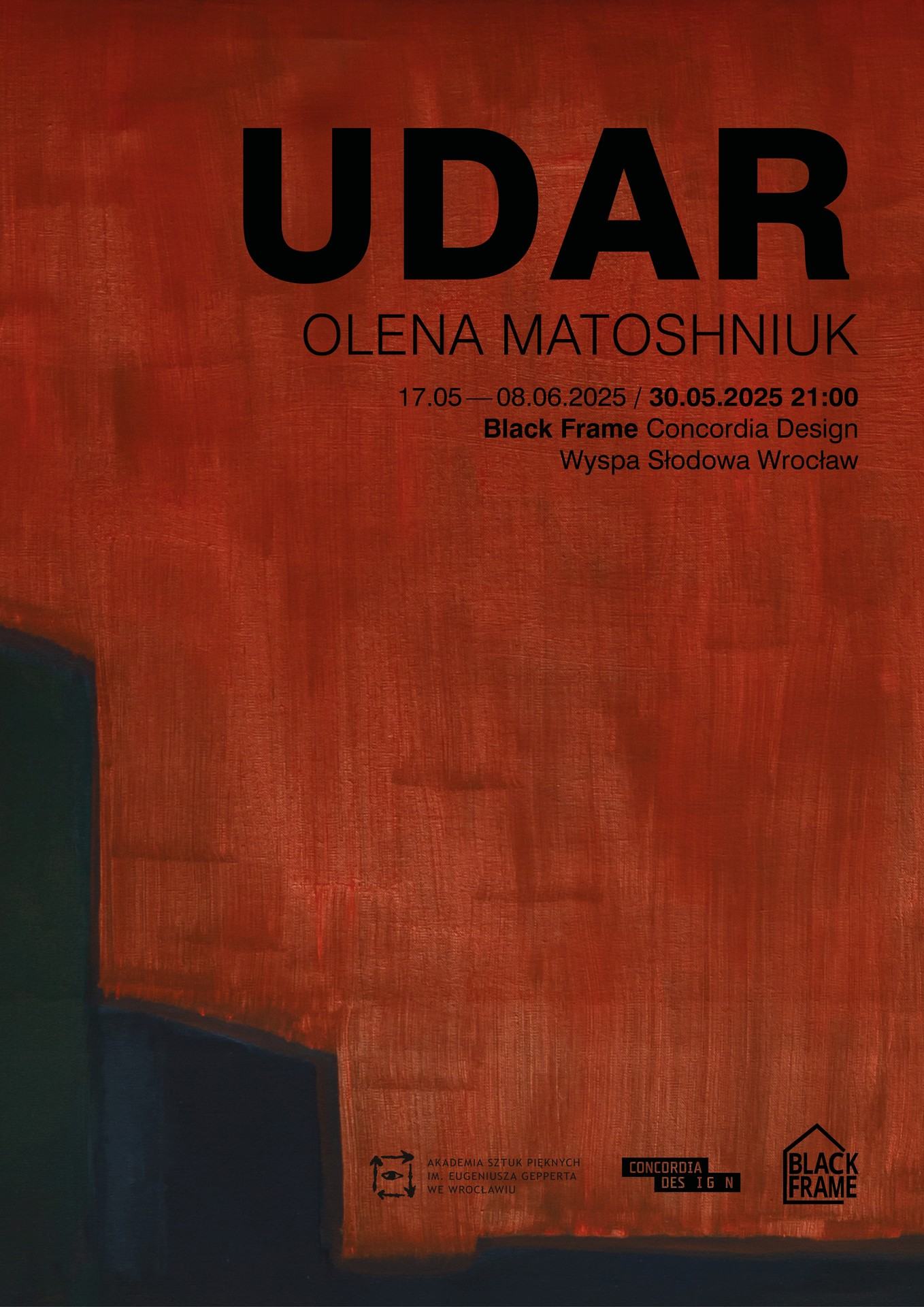 Udar, to tytuł intermedialnej instalacji malarskiej Oleny Matoshniuk prezentowanej w pawilonie zewnętrznym Black Frame na Wyspie Słodowej we Wrocławiu. Wieloznaczności tego słowa oraz różnice w jego znaczeniu w językach polskim i ukraiński, doskonale oddają założenia programowe tej prezentacji. Artystka w subtelny ale jednocześnie dosadny sposób odnosi się do niezwykle trudnej i traumatycznej sytuacji w jakiej znalazły się osoby cywilne w związku z trwającą za naszą wschodnią granicą wojną. Prace te nie epatują przemocą czy drastycznymi przedstawieniami. Jednak w dosadny sposób przypominają o trwającej nieopodal wojnie i wciąż otwarty problemie jej ofiar, zmuszając odbiorcę do głębszej refleksji.