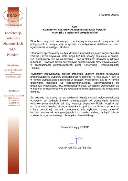 Ze względu na trudny do przewidzenia rozwój sytuacji epidemiologicznej wzywamy do podjęcia kroków zmierzających do przesunięcia terminu wyborów prezydenckich, tak aby wszyscy obywatele Polski mogli wziąć udział w tym doniosłym akcie, w warunkach zgodnych zarówno z duchem jak i literą demokracji. Warunki przeprowadzenia wyborów muszą zapewnić bezpieczeństwo zdrowia głosujących i, co bardzo ważne, zachęcić ich do spełnienia tego tak ważnego obowiązku obywatelskiego.