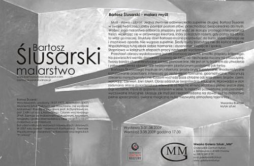 Bartosz Ślusarski – malarz myśli Myśl – słowo – obraz. Jedna sfera nie odzwierciedla zupełnie drugiej. Bartosz Ślusarski w swojej twórczości jakby pomijał poziom słów, przechodząc bezpośrednio do myśli. Wobec jego malarstwa odbiorca zmuszony jest wyjść ze skorupy prostego interpretatora treści, wcielając się w aktywnego kreatora, który za każdym razem, gdy patrzy na obraz, to widzi go inaczej. Strukturę dzieł Bartosza można przyrównać do burzy, która się wzmaga i stopniowo opada. Nie wygasa zupełnie. Ślady burzy pozostają nie do końca zatarte. Współistnieją tutaj obok siebie harmonie i dysonanse, napięcie i spokój. Stopniowo, w kolejnych etapach pracy następuje wyciszenie. Przestrzeń obrazu wydobywana jest za pomocą szpachli, zmiotki, papieru ściernego. Na powierzchni werniks damarowy pojawia się jakby od niechcenia rzucony na płaszczyznę. Tworzy bardzo charakterystyczne zacieki, pionowe linie. Nie jest on tu tylko środkiem do utrwalenia i zabezpieczenia obrazu, ale tworzywem plastycznym podobnie jak farby. Bartosza Ślusarskiego inspiruje architektura, proste bryły kubistyczne, modernistyczne kształtowanie przestrzeni. Interesują go zestawienia formalne, geometryczne. Fascynują zderzenia monochromatyczne. Czasem wychodzi poza chłodne odcienie zieleni, brązów, czerni, wplatając czerwień, biel i błękit. Obraz oddziaływuje bezpośrednio, intuicyjnie. Wprowadza w stan zadumania, skłania do kontemplacji, oderwania od tego hic et nunc na zobacz głębiej i jeszcze dalej. Daje wyciszenie, impuls do spojrzenia z dystansem w siebie. To malarstwo pozawerbalne, poza poznaniem, wyczuwalne intuicyjnie. Ukazuje jak myśl jest nieprzekładalna na słowo. Jest to malarstwo pełne sprzeczności, owiane magiczną nutą, niezwykłą atmosferą tajemnicy. Weronika Burman BARTOSZ ŚLUSARSKI Wrocławianin , urodzony 19.07.1977. Absolwent (2007) Akademii Sztuk Pięknych we Wrocławiu na Wydziale Malarstwa i Rzeźby w pracowni prof. Aleksandra Dymitrowicza, dr hab. Zdzisława Nitki i ad. Łukasza Morawskiego. STRONA WWW : http://bartoszslusarski.blogspot.com