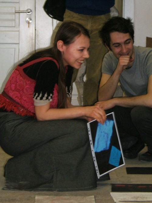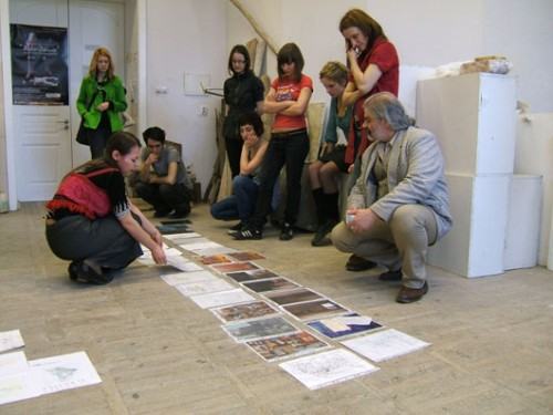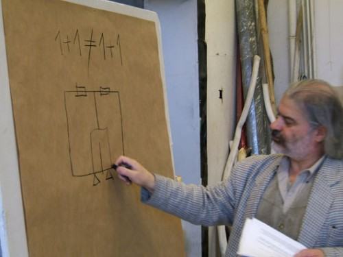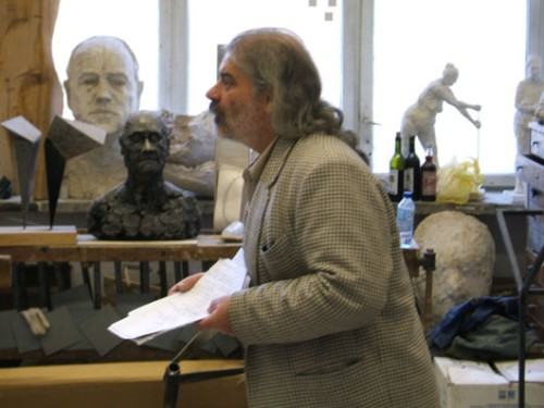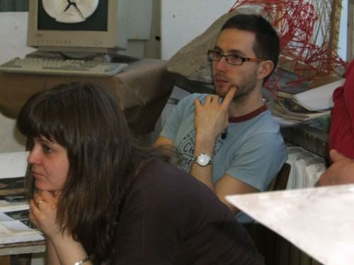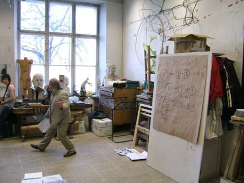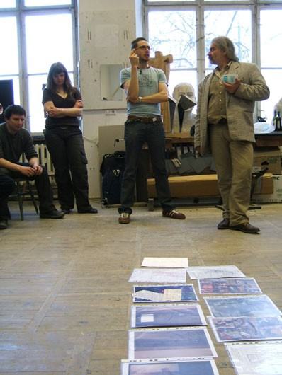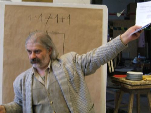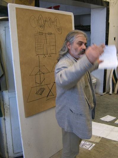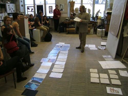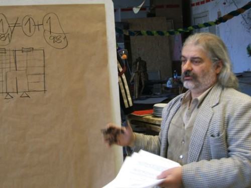 Przyniesione przez studentów szkice stały się punktem wyjścia dla wykładu, w którym prowadzący pracownię 1/2 prof.Christos Mandzios przedstawił studentom swoje spostrzeżenia na temat chaosu, ruchu, przesrzeni... Następnie, po krótkiej analizie tych ogólnych pojęć, powiedzieć by można - natury filozoficznej, przeszliśmy do zagadnień... matematycznych. Profesor prezentował skoplikowane wykresy, dodawał przestrzeń do pzestrzeni, mnożył, dzielił... Czego zatem uczą na tej rzeźbie?! Poza kompozycją, kształtowaniem brył i płaszczyzn, poza technologią obróbki drewna czy kamienia, istnieje szereg zagadnień, można powiedzieć podstawowych, którymi rzeźba zajmuje się z racji swego zainteresowania przestrzenią w szerszym tego słowa znaczeniu. Fizyka, matematyka czy filozofia to dziedziny nauki, których problematyka pokrywa się z obszarami badań rzeźbiarza. Zaś Relacja pomiędzy człowiekiem a przestrzenią, nawet tak podstawowa, jak poruszanie się w obrębie jakiegoś terytorium (patrz zadanie domowe) jest dla tch badań podstawą. Co dopiero, gdy na terytorium owym dojdzie do spotkania choćby dwóch osób. tekst Magda Grzybowska fot. Marek Sienkiewicz