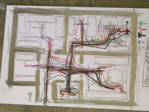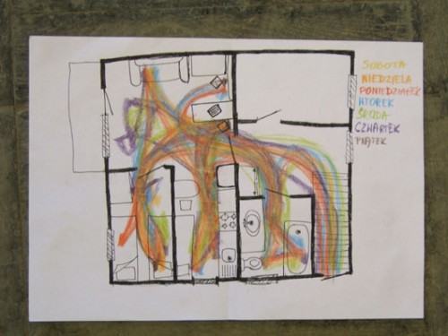 Zadanie domowe brzmiało: przez tydzień za pomocą linii, punktów i notatek zaznaczać na papierze, jak w ciągu dnia poruszałeś się po mieszkaniu, pokoju, mieście...