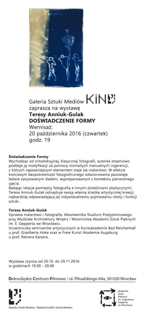 Zapraszamy na wernisaż wystawy Teresy Anniuk-Gulak "Doświadczenie Formy" w galerii Kino. Czwartek 20.10.2016 o godzinie 19.00