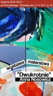 Wernisaż : 5 listopada 2011r. o godz. 18.00 Pl. Piłsudskiego 1c Bolesławiec "Malarstwo Anny Nosowicz to walka z rzeczywistością, próba przeniesienia na płótno tego, co widzialne, poprzez użycie subiektywnych "narzędzi", a mimo wszystko przywodzących na myśl faktyczne obrazy z rzeczywistości - barwy i światła. Artystka jest doskonałą obserwatorką, świat postrzega za pomocą kolorów. Główne części swoich obrazów przedstawia poprzez mocne, nasycone, żywe i często jaskrawe plamy. Równoważy je natomiast dzięki monochromatycznej, zimnej i stonowanej kolorystyce "tła". Świat obserwowany przez artystkę przestaje mieć swoją wyraźną formę - ważne jest jedynie co wyraża się nie w linii czy w formie, lecz barwie która żyje tu własnym autonomicznym życiem. Dynamiczna, abstrakcyjna forma stanowi tu produkt uboczny "działań" plamy barwnej - na przekór prawom realnej rzeczywistości, kolor tworzy i jest głównym tematem, nie zaś dopełnieniem. Uproszczona forma nie traci tu jednak zupełnie na znaczeniu, ale to właśnie impastowo nakładana na płótno farba, jest czynnikiem sprawczym. Malarstwo Anny Nosowicz wymyka się współczesnym trendom, jej obrazy to odzwierciedlenia dążeń twórczych, mające swe konotacje ze sztuką współczesnych kolorystów takich jak Leon Tarasewicz, ale i abstrakcyjnego ekspresjonizmu malarzy nowojorskich lat 40. i 50. XX wieku. Artystka sięga zatem po różnorodne inspiracje, jej sztuka natomiast nosi znamię improwizacji artystycznej oraz jest wyrazem działań spontanicznych."/ Urszula Łączna Anna Nosowicz Edukacja: 2008-2010 - Wrocławska Wyższa Szkoła Informatyki Stosowanej, Tworzenie aplikacji internetowych 2003-2008 - Akademia Sztuk Pięknych we Wrocławiu, kierunek: Malarstwo 2006-2007 - Academy of Fine Arts and Design, Bratysława, Słowacja, stypendium Erasmus/Socrates 1998-2003 - Państwowe Liceum Sztuk Plastycznych we Wrocławiu, formy użytkowe: jubilerstwo od 2008 - członek ZPAP od 2006 - członek grupy artystycznej "Błond w sztuce" Wystawy, warsztaty: 2010 - Wystawa, galeria Podwale 62, WCP Wrocław - Wystawa grupy "Błond w sztuce", Galeria pod Plafonem, Wrocław 2009 - Wystawa OPEN ERROR, 1500m2 do wynajęcia, Warszawa 2008 - Projekt Graffiti Non Stop, pl. Nowy Targ, Wrocław - Wystawa podyplomowa, BWA Awangarda, Wrocław - Wystawa grupy "Błond w sztuce" ODA Firlej, Wrocław - Międzynarodowy festiwal scenarzystów w Bourges, Francja 2007 - Wystawa grupy "Błond w sztuce", Szewska36, Instytut historii sztuki, Wrocław - Wystawa "Dziewczęta profesora", Browar Mieszczański, Wrocław - Wystawa studentów AFAD, Bratysława, Słowacja 2006 - Wystawa koła artystyczna naukowego "Osiem i pół", OPT Wrocław - "Zielona" wystawa, Dom E.Stein, Wrocław 2005 - Workoshop Kanion Sztuki, Bełchatów - Wystawa koła artystyczno naukowego "2+x", Galeria Akademia, Wrocław - Wystawa pracowni 114, galeria pod Plafonem, Wrocław