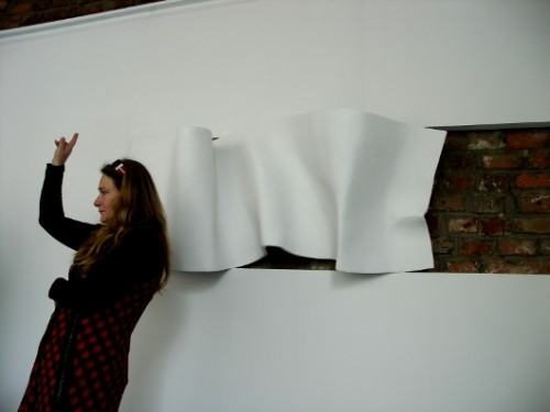 Dyplom rzeźbiarski Justyny Drozd. W witrynie BWA odbyła się obrona dyplomu Justyny Drozd z pracowni rzeźbiarskiej prof. Christosa Mandziosa. Tematem przygotowanej przez Justynę wystawy była „Płasko-przestrzeń”. Wszystkie elementy, które złożyły się na tę instalację przygotowane zostały przez samą autorkę – gipsowe listwy wykonała ona własnoręcznie w jednej z pracowni sztukatorskich, podobnie jak motyw zdeformowanej, zwiniętej niejako ściany. Gips stał się zatem podstawowym materiałem – budulcem instalacji Justyny Drozd. Materiał ten opanowała ona zarówno w praktyce jak i w teorii, gdyż praca magisterska „Gips – szlachetny materiał rzeźbiarski”, jak sam tytuł głosi, dotyczyła gipsu właśnie. Instalacja Justyny jest minimalistyczna w formie, a problemy jakie porusza (relacja pionów i poziomów, płaszczyzny i przestrzeni) należą do fundamentalnych zagadnień rzeźbiarskich. Praca ta nie staje się przez to ani trochę przeciętna, gdyż środki, jakie dobrała autorka są indywidualne i świadczą o nieprzeciętnej wrażliwości. Prostota percepcji i przekazu w połączeniu z precyzją i subtelnością stanowią o wartości „Płasko-przestrzeni”. zapraszam na fotorelację – Fot. Magda Grzybowska