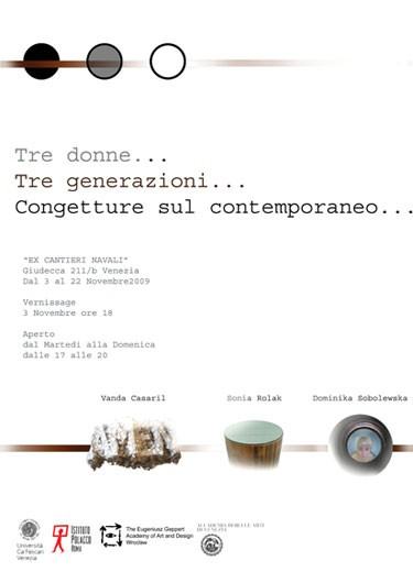 „To wystawa zorganizowana przy współpracy z dwiema niezależnie działającymi artystkami -Wandą Zamichieli- najstarszą z grupy urodzoną we Włoszech oraz z Sonią Rolak -urodzoną w Polsce, od 30 lat mieszkającą i działającą we Włoszech. Jesteśmy przedstawicielkami trzech różnych pokoleń oraz trzech różnych tożsamości. Każda z nas dotychczas na swój sposób poprzez swoje prace podejmowała dialog z problemami współczesności. Stawiając sobie pytanie o kondycję moralności współczesnego człowieka oraz o stan jego najbliższego środowiska, staramy się w prosty sposób sprowokować widza do głębszej refleksji. Głównym terenem naszych poszukiwań twórczych są problemy płci, samotności, wyobcowania czy globalizacji. Każda we właściwym sobie charakterze pokaże pracę podejmującą jeden z wybranych problemów, patrząc przez pryzmat osobistych doświadczeń i przeżyć stara się we właściwy sobie sposób skomentować tzw. zastaną rzeczywistość.” Wystawa została otwarta 3 listopada i potrwa do 22 listopada. To Galeria na wyspie Giudecca położonej tuż na przeciwko pl. Św. Marka. Ares: Giudecca 211/b, Wenecja - "Ex Cantieri Navali" Magdalena Kacprzak-Gagatek zdjęcia: Luca Demarchi
