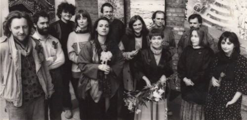 Studenci i asystenci pracowni prof. Wandy Gołkowskiej, Gosia w centrum po lewej obok prof. Wandy Gołkowskiej, prawdopodobnie 1989 rok