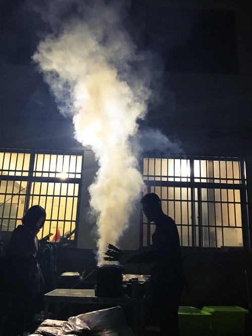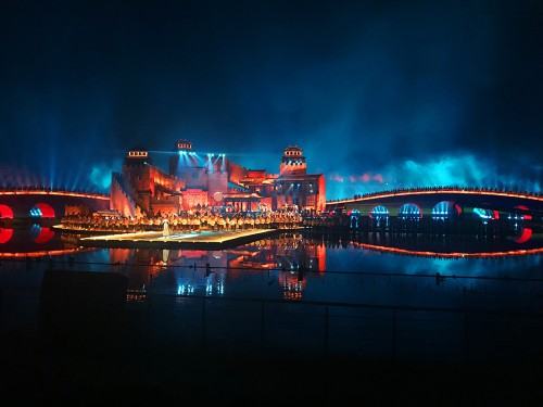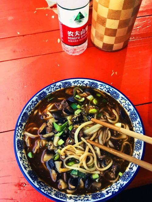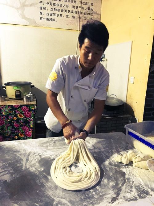 Kolejny dzień i (…) wizyta w odrestaurowanym miasteczku, o malowniczych, krętych uliczkach oferujących specjały kuchni shanxi. Wyśmienity chiński makaron, który w popisowy sposób wirował we wprawnych rękach kucharza stanowił główną część porcji „michy" z wołowiną, za którą stała kawalkada niecierpliwie wyczekujących w strugach deszczu smakoszy. Odstałem swoje, ale było warto, a rozgrzewająca strawa zachęciła do udziału w nocnym przedstawieniu na wolnym powietrzu. Nocny występ kilkuset aktorów w strugach deszczu, pośród kaskad sztucznych ogni i kompilacja kolorowych parasoli na ogromnej widowni powracają we mnie zadziwiająco realnym wspomnieniem baśniowej iluzji.