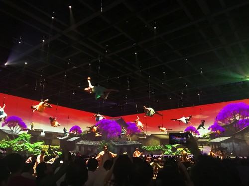 Widowisko rozpoczyna się w dość tradycyjny sposób: jest widownia, scena – nic nadzwyczajnego, poza tym, że wszystko zajmuje nieco większą przestrzeń. Wreszcie, zaczyna się, są aktorzy, światła, jest muzyka… Po chwili rozpoczynają się projekcje rzutowane na ekran z siatki mesh oddzielający widownię od sceny. Jest dość dynamicznie… Kilka minut później jesteśmy zaproszeni do wejścia w strefę sceniczną, aktorzy przechodzą tuż obok nas. Po wejściu na scenę okazuje się, że scena to tak na prawdę kilkanaście platform poruszających się w płaszczyźnie wertykalnej. Każda z nich prezentująca inny wątek opowieści i mieszcząca kilku, czasem kilkunastu aktorów. Poszczególne sceny są wydobywane z ciemności światłem i w ten sposób poznajemy kolejne odsłony kilkugodzinnego spektaklu. Przejście do następnej sali (…), a tutaj odmienny sposób aranżacji przestrzeni sprawia, że wszyscy jesteśmy w centrum akcji. Kilkudziesięciu aktorów odgrywa odsłony misternie skonstruowanej opowieści, która bez tłumaczenia pozostaje dla nas doświadczeniem dynamiki wizualno-akustycznej. Jesteśmy zaskoczeni rozbudowaną i niezwykle dopracowaną scenografią.