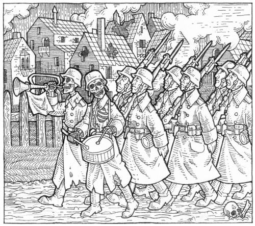 Rysunki gloryfikujące przesłodzony romantyzm rewolucji sowieckiej czy kompozycje pełne niemieckich mundurów są dla nas ciągle obrazem przykrym czy wręcz irytującym. Ale uważny obserwator dostrzeże tragizm człowieka - żołnierza, człowieka - mięsa armatniego. Niezależnie od czasów, munduru i zawsze z jednakową pogardą traktowanego przez polityków, tyranów, wszelkiego rodzaju posiadaczy racji i głosicieli jedynej prawdy. W scenach militarnych jest jednocześnie dbałość o realia epoki, zgodny z historią mundur czy broń, odpowiednia architektura, właściwe papierosy lub gazeta na stole, ale jest też po prostu tragizm wojny, jej bezwzględność i bezsens. Rysunki o wojnie są antywojenne.