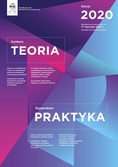 Konkurs TEORIA to program, w ramach którego zwycięski tekst, podejmujący w sposób ciekawy i nowatorski tematykę związków architektury i kultury, zostanie opublikowany w formie dwujęzycznej, polsko-angielskiej książki. Laureat Konkursu TEORIA otrzyma ponadto nagrodę finansową w wysokości 3.500 zł. Dodatkowo Fundacja zapewnia promocję publikacji i jej autora bądź autorów. Jury w znamienitym składzie: Przewodnicząca Ewa P. Porębska, Agnieszka Jacobson-Cielecka, Grzegorz Piątek, Jacek Purchla, Bogna Świątkowska, Marta A. Urbańska, Piotr Sarzyński będzie oceniać prace pod względem ich tematyki, merytoryczności, oryginalności, spójności i jasności przekazu, a także istotności w kontekście kulturotwórczej roli architektury.