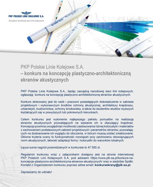 Więcej informacji na: https://www.plk-sa.pl/konkurs-na-koncepcje-plastyczno-architektoniczna-ekranow-akustycznych/