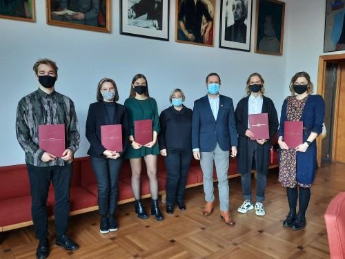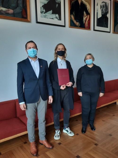 Stypendyści odebrali dyplomy z rąk Rektora Akademii Sztuk Pięknych im. Eugeniusza Gepperta we Wrocławiu, prof. Wojciecha Pukocza oraz Prorektor ds. dydaktycznych i studenckich, dr hab. Beaty Mak – Soboty podczas uroczystego spotkania w Sali Senatu ASP 4 grudnia 2020 roku.