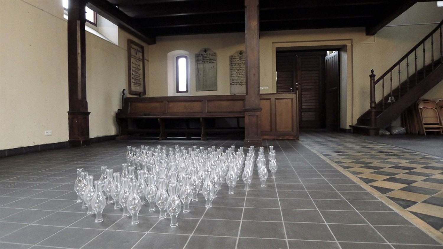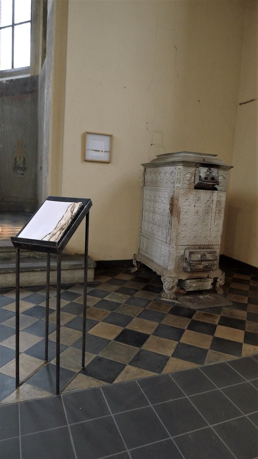 „Kazanie” – obiekt na ambonie; „Kadr” – rama z tkaniną przed ołtarzem; „Dusze” – obiekty ze szklanych elementów; „Garść” – praca wobec chrzcielnicy; „Requiem dla ognia” – obiekt i praca na ścianie obok pieca; „Jałmużna” – czarna miseczka; „Śpiewnik” – papierowa praca na ławce dla wiernych; „Wierny” – praca obracająca się; „Osad” – prace z popiołem i woskiem; „Łódź” – niebieska rzeźba dwuelementowa.
