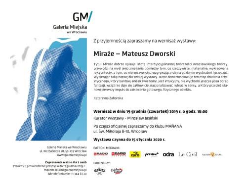 Od 20 grudnia 2019 roku przestrzenie Galerii Miejskiej wypełnią się rysunkiem, grafiką, malarstwem, rzeźbą oraz plakietą Mateusza Dworskiego, artysty związanego z wrocławską Akademią Sztuk Pięknych.