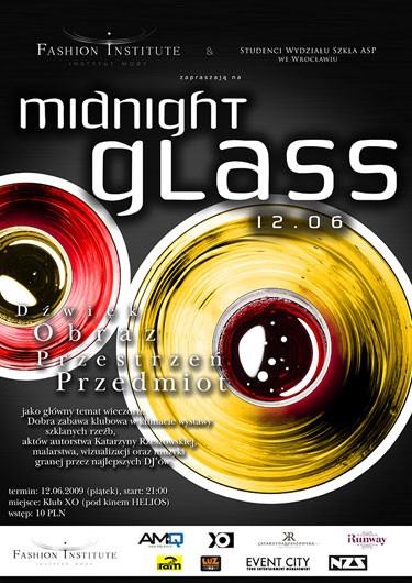 Swoje prace prezentować będą: Arek Banaś, Magdalena Gaik, Katarzyna Herniczek, Małgorzata Gawronek, Ewa Kostrzewska, Ewelina Madej,Matylda Makulska, Paweł Sawa, MartaSawicka, Anna Sikora,Zofia Skrzypczak, Marta Zawierucha. Ponadto wystawa zdjęć Katarzyny Rzeszowskiej z serii "Fem - ukryte piękno, oraz malarstwo młodych twórców. Na dwóch potężnych ekranach przez cały wieczór prezentowane będą wizualizacje, zdjęcia prac, grafiki, a także odrobina propozycji ze świata mody. Temu wszystkiemu towarzyszyć będzie odpowiednia muzyką grana przez najlepszych wrocławskich DJ-ów. Impreza "Midnight Glass" jest połączeniem wystawy, wernisażu i dobrej zabawy klubowej Bilety wstępu w cenie 10 zł można zamówić pod adresem k.herniczek@gmail.com, u studentów III roku szkła lub nabyć w dniu imprezy w Klubie XO. Serdecznie zapraszam Katarzyna Herniczek