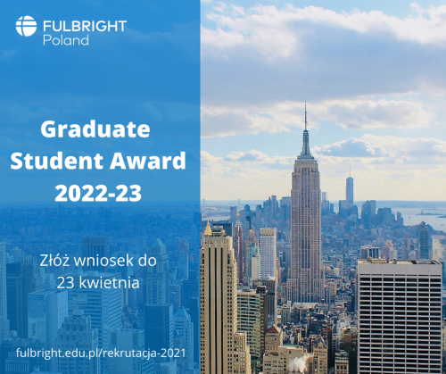 Program dla Polaków zainteresowanych rozpoczęciem studiów magisterskich bądź doktoranckich w USA, zapewniający finansowanie pierwszego roku nauki w wysokości do 47 000 USD, z możliwością przedłużenia na kolejny rok. Przyjmowane są wnioski na wszystkie kierunki studiów z wyłączeniem programów medycznych wymagających bezpośredniego kontaktu z pacjentem, LLM (Master of Laws) oraz MBA (Master of Business Administration). Wyjazd jest możliwy na każdą akredytowaną uczelnię wyższą. Nabór trwa do 23 kwietnia. Więcej informacji: fulbright.edu.pl/graduate-student-award