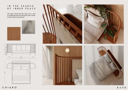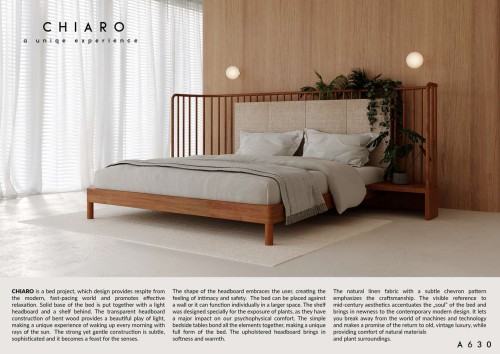 O projekcie: CHIARO to projekt łóżka powstały na bazie czynników sprzyjających efektywnemu relaksowi. Głównym założeniem projektu jest kreacja atmosfery odpoczynku poprzez otoczenie naturalnymi materiałami i naturą samą w sobie – konstrukcja wezgłowia przewiduje miejsce na umieszczenie roślin doniczkowych. Produkt ma powstać w całości z drewna – rama łóżka zespolona z dwoma stolikami oraz wezgłowie z elementami giętymi i lnianą tapicerką. Stylistyczne nawiązanie do designu mid-century sugeruje odejście od wszechotaczającej nas technologii i ukierunkowanie na niczym niezakłócony odpoczynek w naturalnym otoczeniu.