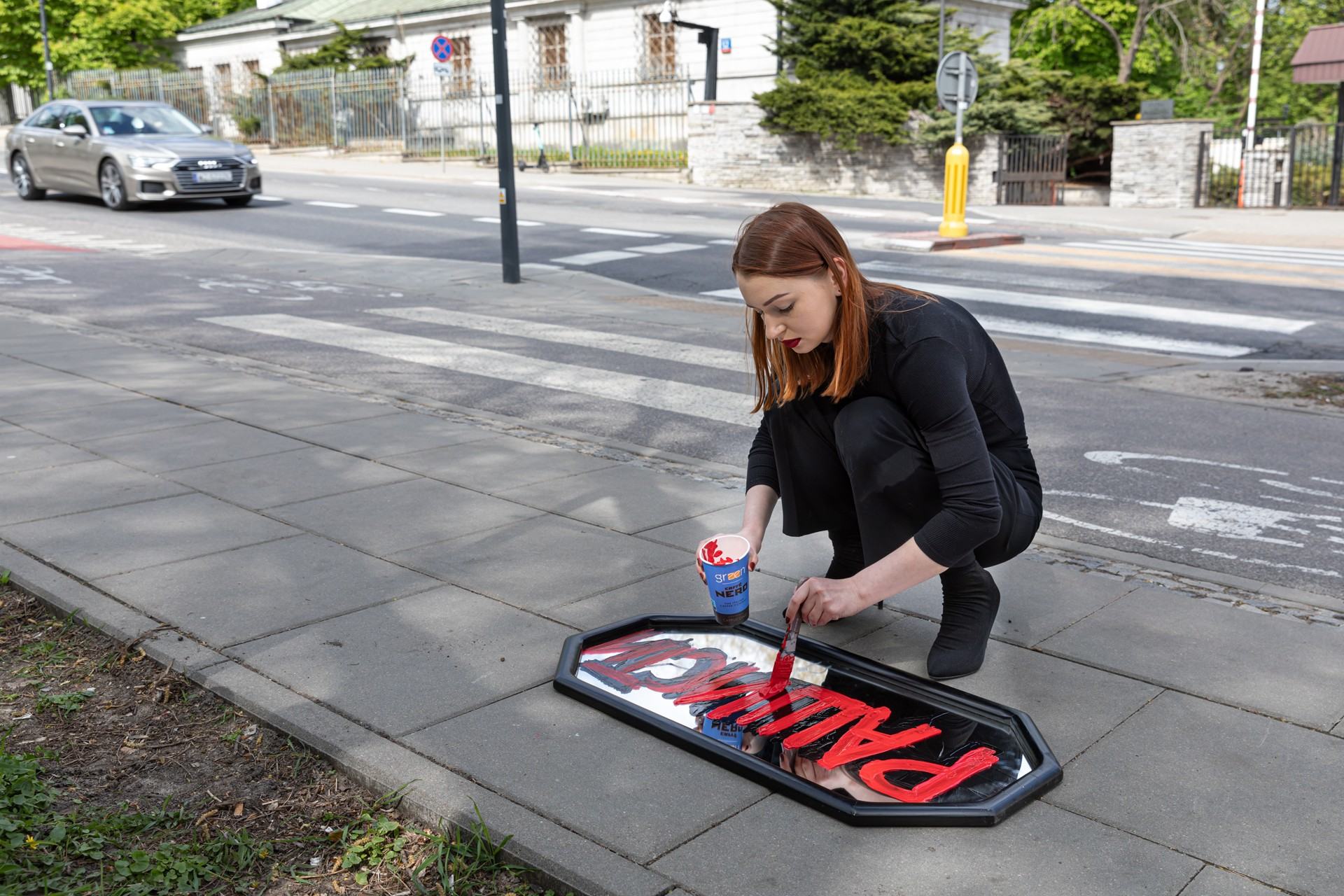 Olena Matoshniuk, Przywitanie, performance, akryl na lustrze, Ambasad Federacji Rosyjskiej, Warszawa, 04.05.2022 r. / Trójstyk graniczny przy Obwodzie Kaliningradzkim, Bolcie, 28.04.2022 r.