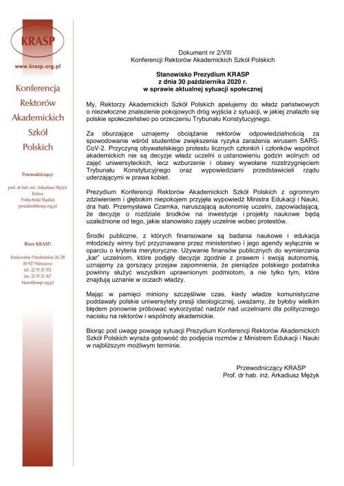 Stanowisko Prezydium KRASP z dnia 30 października 2020 r. w sprawie aktualnej sytuacji społecznej