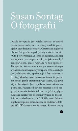 Najważniejsza w historii książka poświęcona fotografii. Wybitna amerykańska intelektualistka bada znaczenie i funkcję fotografii we współczesnym świecie. Czym w swej istocie jest fotografia? Jakie są jej związki z malarstwem i sztuką? Jak zjawisko fotografii zmieniło nasz sposób postrzegania świata? W jakim stopniu fotografia interpretuje rzeczywistość? Jaka jest relacja między fotografem i obiektem oraz między zdjęciem a patrzącym? Na czym polega współczesny heroizm widzenia? Z jakich powodów sięgamy po aparat fotograficzny? Dlaczego skłonni jesteśmy przechowywać zdjęcia bliskich nam osób. www.karakter.pl
