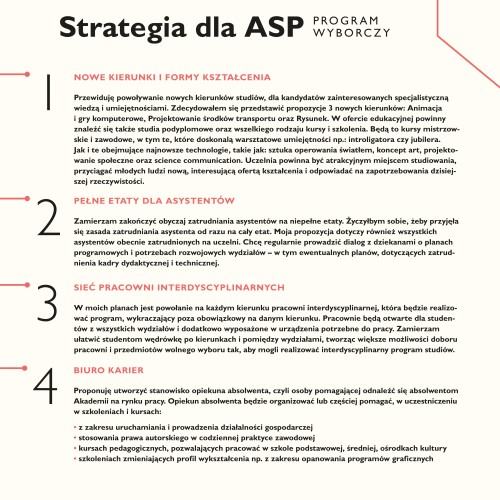 Chciałbym wzmocnić prestiż i znaczenie uczelni w Polsce i za granicą, poprzez zrównoważone i skuteczne działania w wybranych obszarach. Zamierzam powrócić do istoty działalności Akademii – do kształcenia artystów i projektantów.