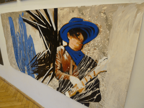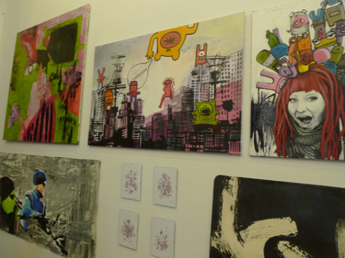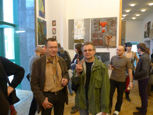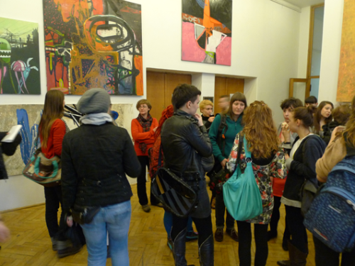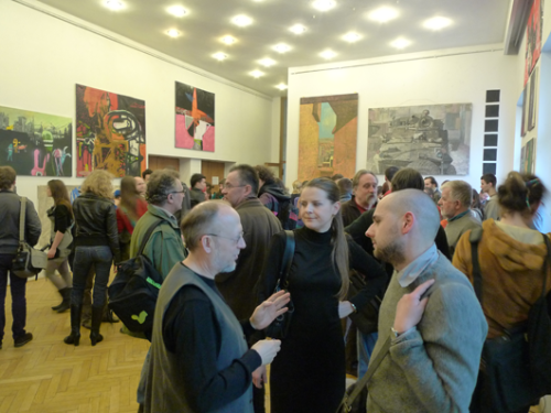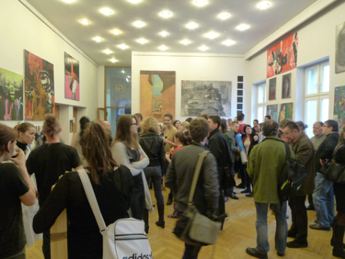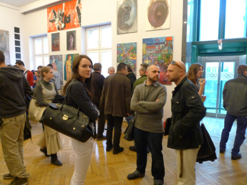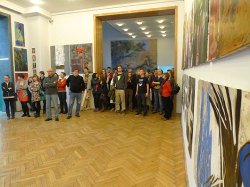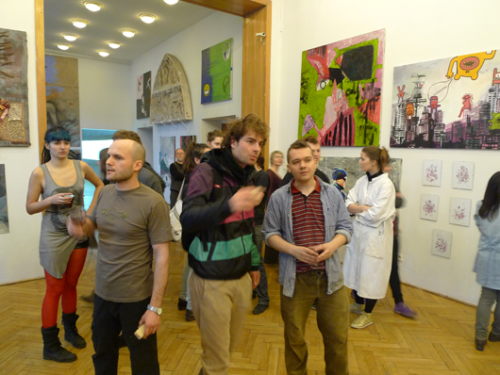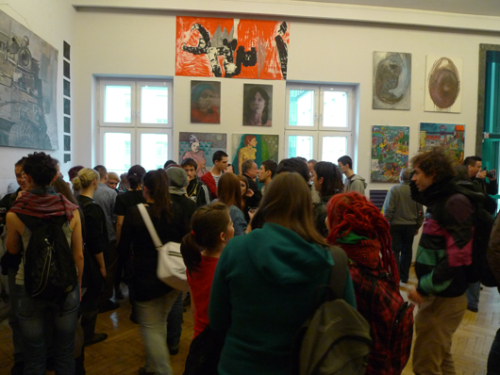 Swoje obrazy i rysunki w holu przed aulą pokazują studenci prof. Krzysztofa Skarbka , as. Pawła Liska i ad. Piotra Tyszkowskiego
