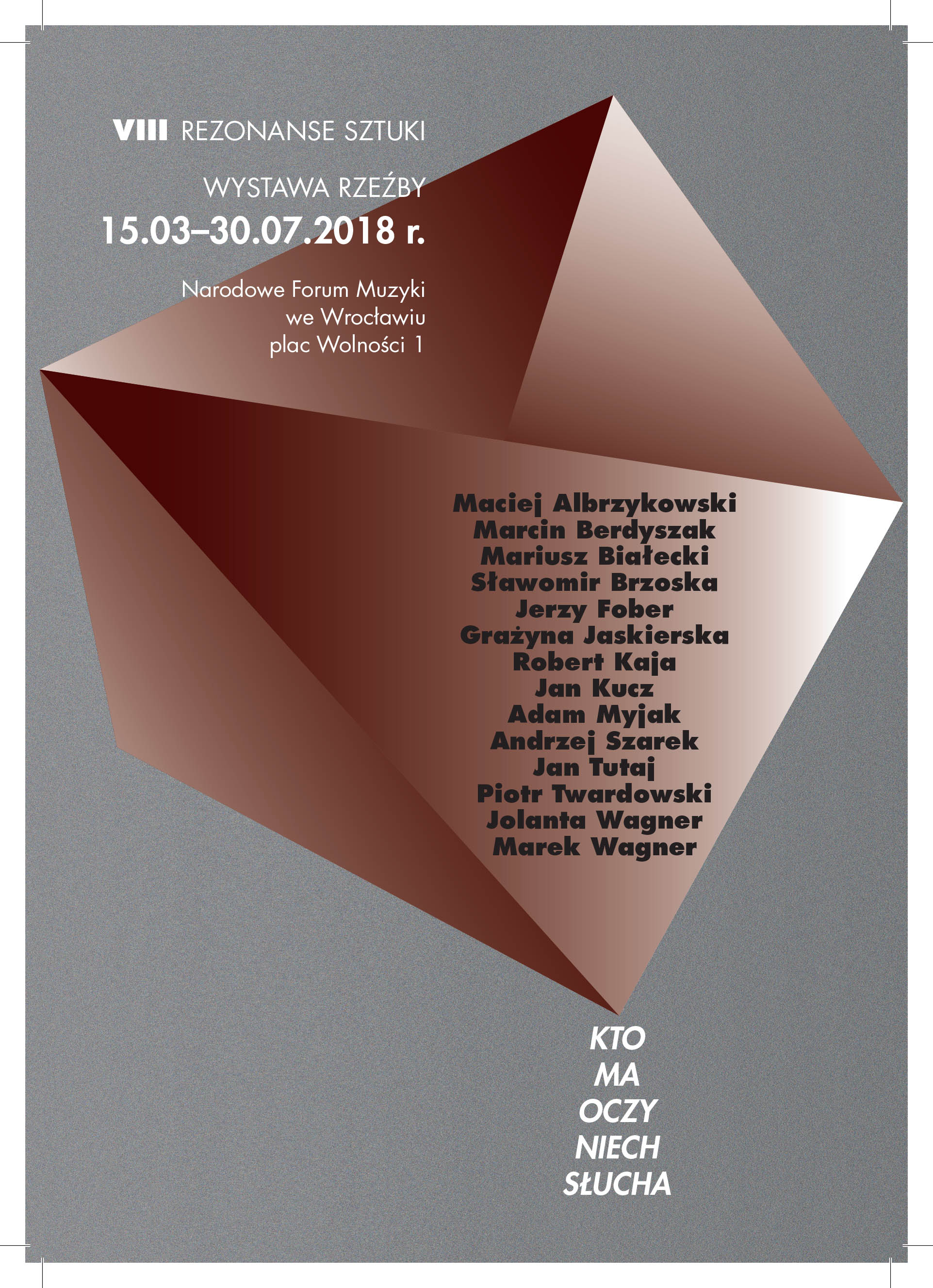 przygotowując dla Państwa od sierpnia 2015 roku artystyczne prezentacje we wnętrzach Narodowego Forum Muzyki pod wspólnym tytułem „Rezonanse Sztuki", zawsze brałem pod uwagę charakter przestrzeni, jaki tworzą cztery główne poziomy tego wyjątkowego obiektu. Poprzednie wystawy, a było ich siedem, wypełniały szczelnie powierzchnie ścian, gablot i holi, w naturalny sposób zapraszając widza do odbycia spaceru. To odkrywanie uroków przestrzeni i światła w NFM podsunęło mi koncepcję ósmej już ekspozycji. Tym razem z Grażyną Jaskierską z Katedry Rzeźby i Działań Przestrzennych Akademii Sztuk Pięknych we Wrocławiu przygotowaliśmy wystawę obiektów rzeźbiarskich znakomitych polskich artystów. Podtytuł wystawy – Kto ma oczy niech słucha – jest tytułem jednej z prac Jerzego Fobera, który to w sposób absolutnie pełny połączył sztuki wizualne z kunsztem wykonania. Przygotowanie punktowych ekspozycji pozwoli na dość zaskakujące dla Państwa odkrycie rzeźb czternastu uznanych artystów. Wierzę, że w równy sposób zachwycą Państwa siła, ekspresja i artystyczny wyraz prezentowanych prac, jak czystość i subtelność formy wnętrz Narodowego Forum Muzyki.