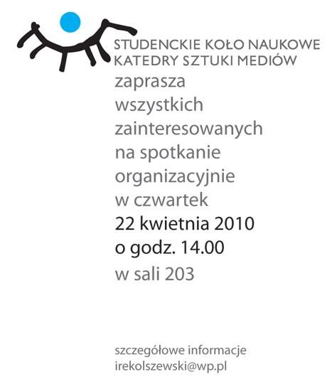 Serdecznie zapraszamy wszystkich zainteresowanych na spotkanie organizacyjne Studenckiego Koła Naukowego Katedry Sztuki Mediów 22 kwietnia (czwartek) o godzinie 14.00, sala 203.