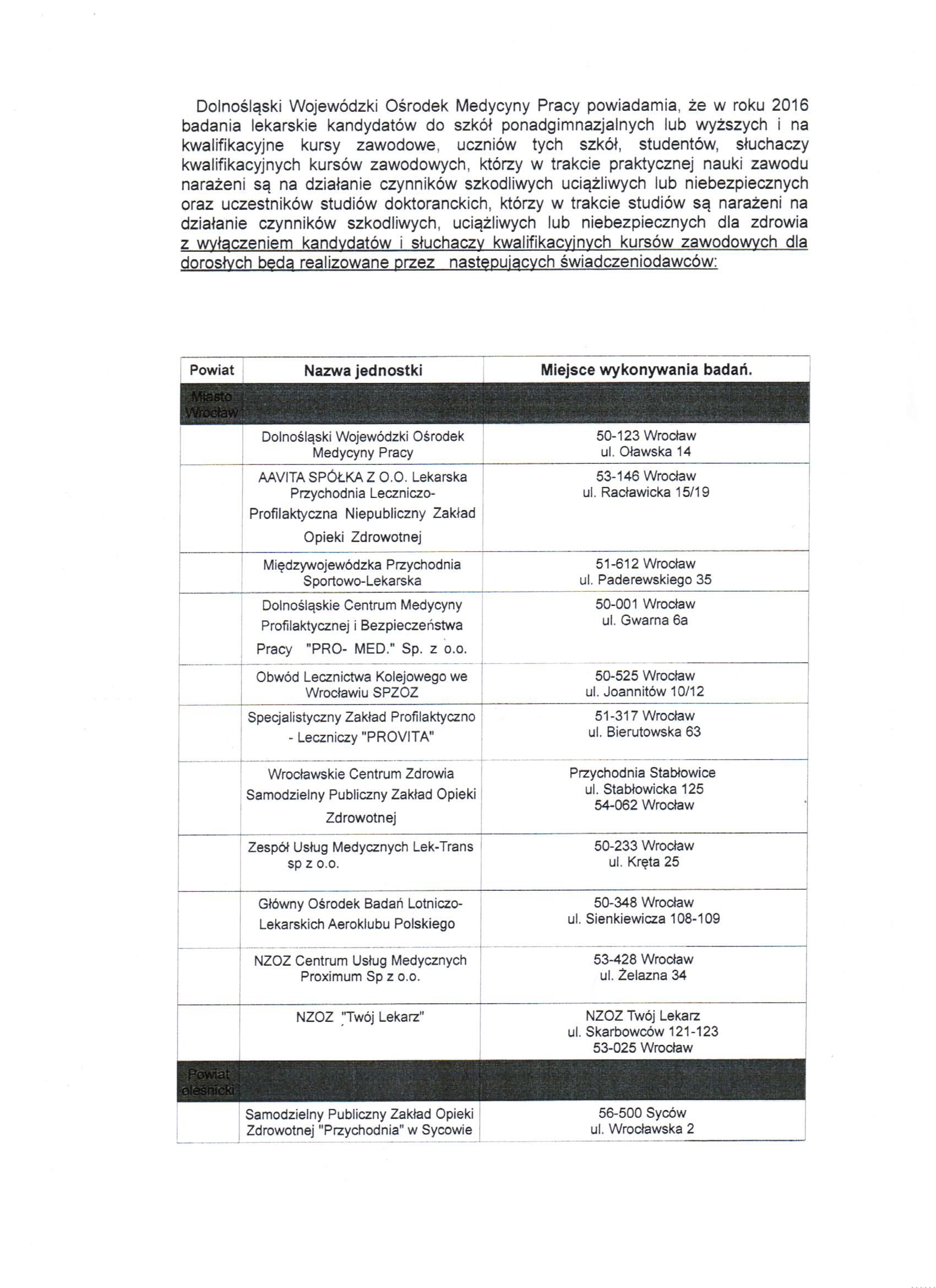 Placówki wykonujące badania Medycyny Pracy str.1
