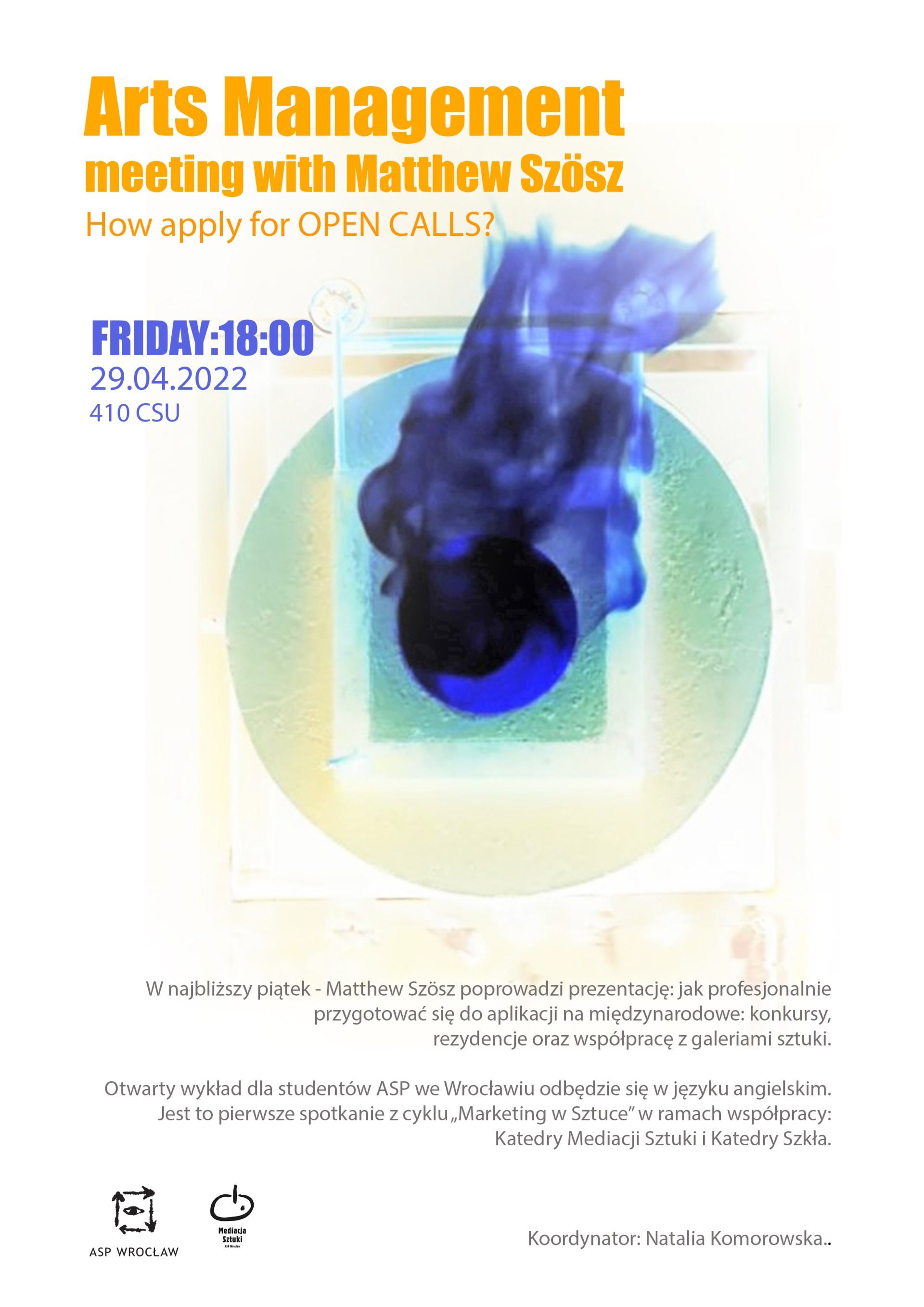 Wykład odbędzie się w języku angielskim. Jest to pierwsze spotkanie z cyklu „Marketing w Sztuce” w ramach współpracy: Katedry Mediacji Sztuki i Katedry Szkła.