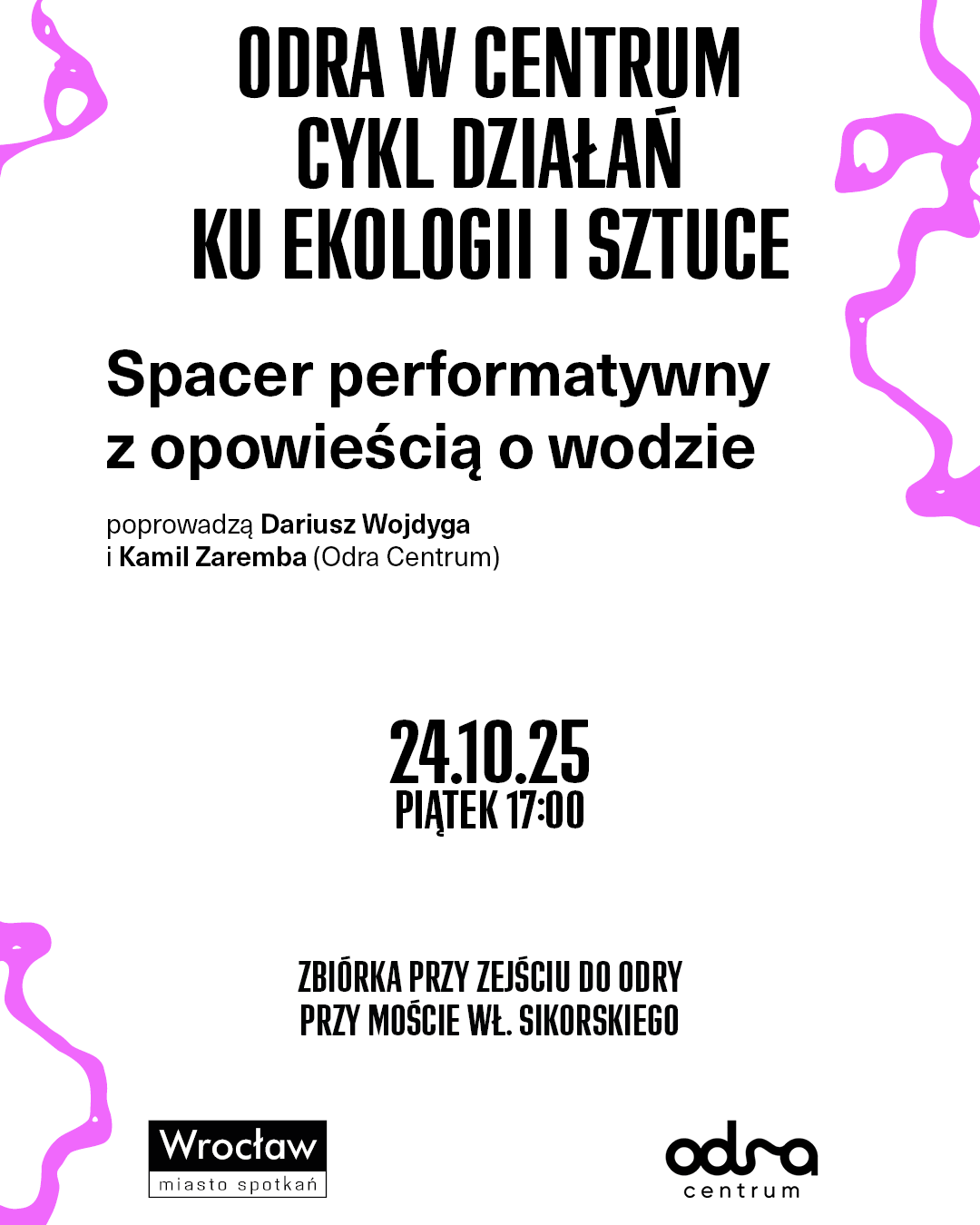 24.10 g.17.00 – spacer performatywny z opowieścią o wodzie - poprowadzą Dariusz Wojdyga i Kamil Zaremba (Odra Centrum) – zbiórka przy zejściu do Odry przy Moście Wł. Sikorskiego