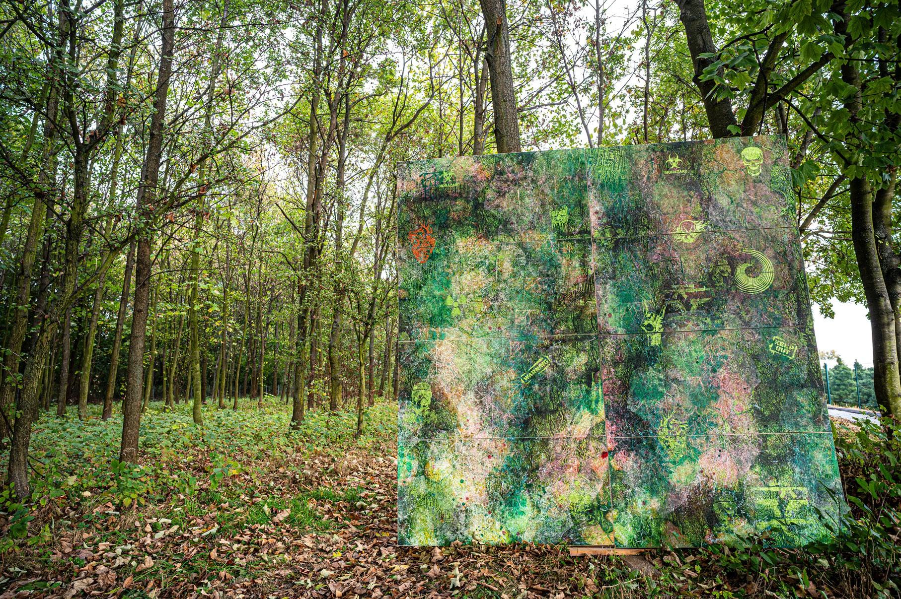 Wtedy, do krainy szczęśliwości zaczęły wkradać się niepokojące sygnały końca sielanki. W gąszczu bogatej, organicznej kompozycji, pod stosem liści, pojawiły się symbole cywilizacji, będące symptomami nadchodzącej katastrofy: odpady masowej nadprodukcji, ślady konfliktów religijnych i politycznych oraz kwestie związane z nieuchronnością przemijania. Pojawiają się też znaki cybernetycznej rewolucji i pożegnanie z homocentryzmem – wszak konstrukcja ludzkiego ciała przypomina budowę każdego innego organizmu na Ziemi. Liść z unerwieniem może przywodzić na myśl zarówno układ krążenia człowieka, jak i ścieżki komputerowej płyty głównej. Sztafaż z liści skrywa COŚ... jest jak makijaż, pod którego powierzchnią ukryte są prawdziwe problemy. Ta iluzja piękna jest rodzajem testu na spostrzegawczość – zamaskowane symbole czekają na odkrycie i rozszyfrowanie.